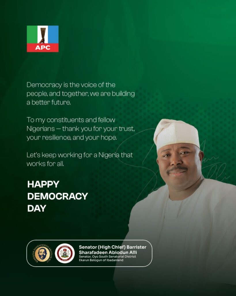 Senator Sharafadeen Alli (APC–Oyo South) has joined millions of Nigerians to commemorate Democracy Day, reaffirming his commitment to good governance, accountability and inclusive leadership for national development.