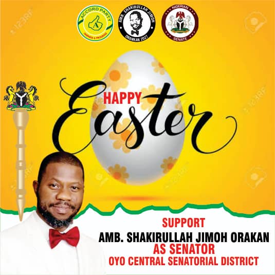 Ambassador Shakirullah Jimoh Orankan, an aspirant for the Oyo Central Senatorial District under the platform of the Accord Party, has extended warm Easter greetings to Christians and all residents of Oyo State, urging them to embrace the values of love, sacrifice, and unity symbolised by the season.