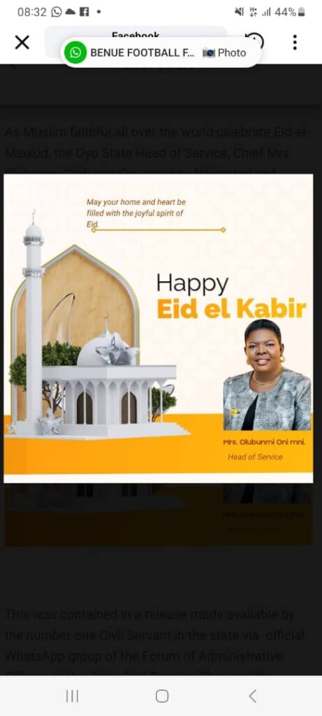 As Muslims across the globe celebrate Eid-Al-Adha, also known as Ileya festival, the Oyo State Head of Service, Chief Mrs. Olubunmi Olufunke Oni, mni has extended warm greetings and best wishes to the Muslim faithful.