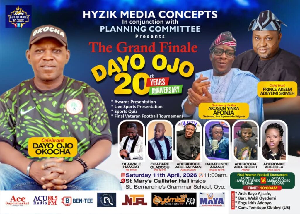 Excitement is building in Oyo town as renowned media outfit , Hyzik Media Concepts, in collaboration with the Anniversary Planning Committee prepare to honor personalities at the grand finale of the 20th anniversary of veteran sports journalist, Dayo Ojo, popularly known as Okocha.