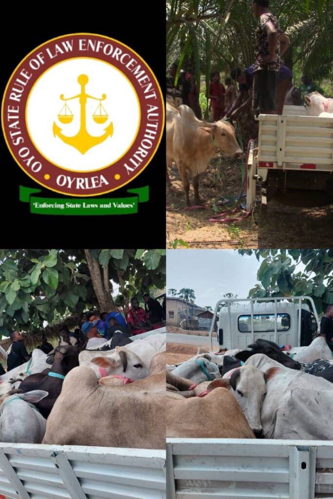 The Enforcement Team of the Oyo State Rule of Law Enforcement Authority (OYRLEA) on Friday impounded Nine Head of Cattle found roaming and grazing freely within the premises of the Ijaye Farm Settlement in the Akinyele Local Government Area of Oyo State.